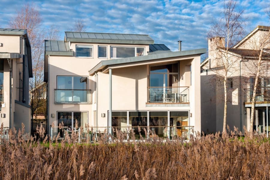 Situated within a private gated area of just 9 individual contemporary homes, bounded to the front by a small waterway, Lagoon Villa is accessed via a small footbridge leading to the front door. The property has been finished internally to high standards by the current owner offering luxurious accommodation. Open plan ground floor, oak flooring with feature wood burning stove to the living area, separate dining area and well equipped kitchen with ample cupboards and work surfaces. One of the main features of the house are the fully glazed ground floor rear elevation which provides stunning views across Somerford Lagoon opening onto enclosed decking area. To the first floor can be found spacious King Master en-suite with private balcony, further king bedroom, twin bedroom, child’s bunk room as well as a family bathroom. A guest suite can be found to the second floor with separate shower room.