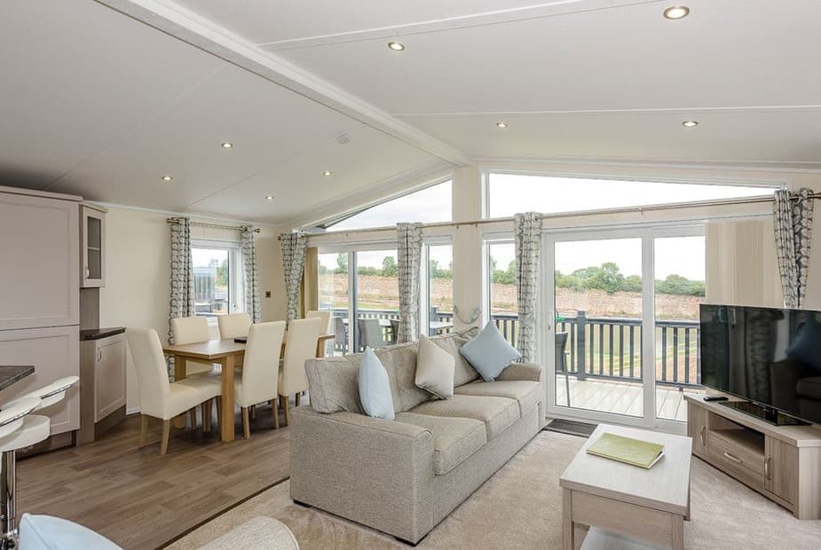 New in 2019. Ultra spacious luxurious lodge with one double with en-suite shower and two twin (can be doubles by arrangement) all with Smart TV. Family bathroom with bath with overhead shower. Modern open plan living and dining area with kitchen including fridge/freezer, oven/grill, dishwasher, washing machine and microwave. Doors leading to decking with quality garden furniture and outdoor hot tub. Selected lodges are available with view over the spectaular Quarry Lake - please check when booking.