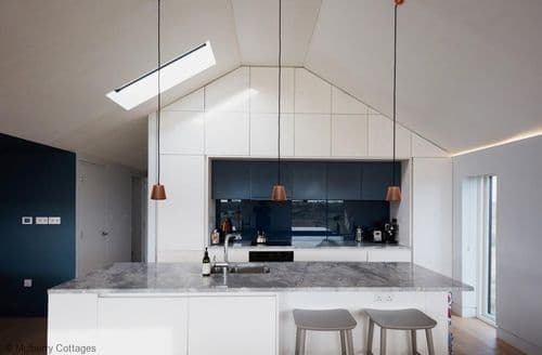 Triple aspect open plan sitting / dining room with integrated kitchen. Living room, seating for 10 guests, log burner, Dining and seating for 10, kitchen with island, electric oven and hob, dishwasher, Saeco coffee machine, built-in recycling bins.