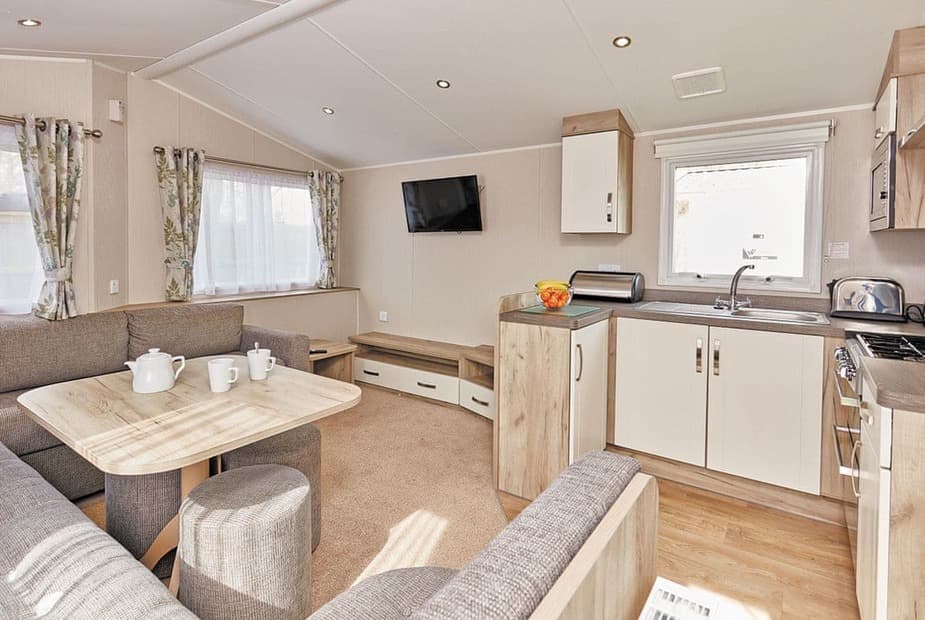 New in 2018, 12ft-wide caravan with one double and one twin. Additional sleeping for two in lounge area. Shower. DVD. Double glazed and centrally heated.