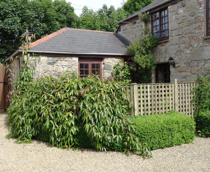 … on Penbroath Farm, Carnhell Green, three cottages beautifully converted from traditional stone barns around a secluded, leafy courtyard tucked 200 yards down a private drive. The cottages share an indoor heated swimming pool (13’ x 9’ x 4’ deep) and each has its own private outdoor space. Shared utility room (washing machine, tumble drier). The friendly owners live in the former farmhouse across the courtyard. Lovely walks all around. Popular farm shop/restaurant, 5 minute drive. Excellent cottages for individual couples/families or to book together for a larger group: a relaxing, peaceful place close to fabulous beaches.