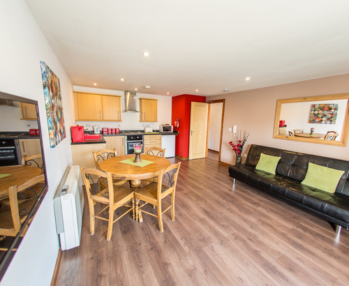 Open plan with kitchen and dining areaOne sofa seating twoFlatscreen TV with Freeview