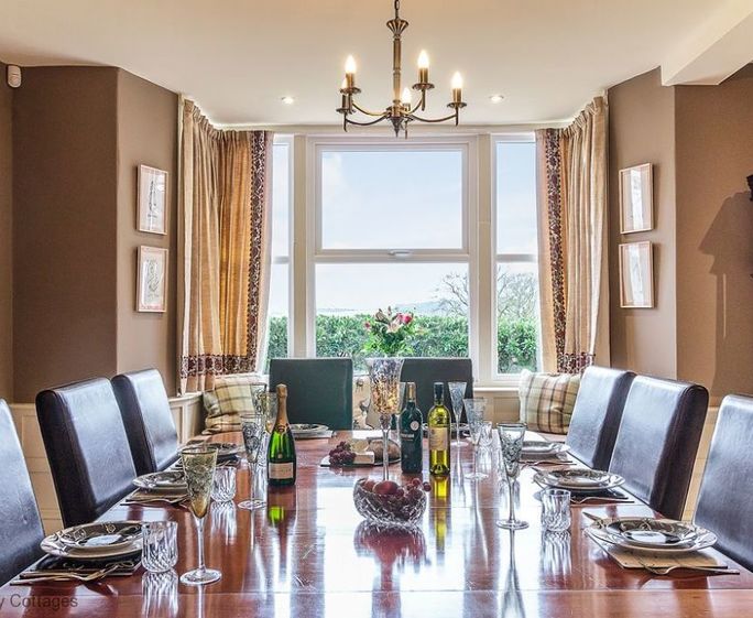 High Grange: sleeps 12 +1 in 6 bedrooms of which 5 have sea views, 5 bathrooms (of which 4 are en suite.) Two acre garden and woods, parking for multiple cars. Games barn with pool table.