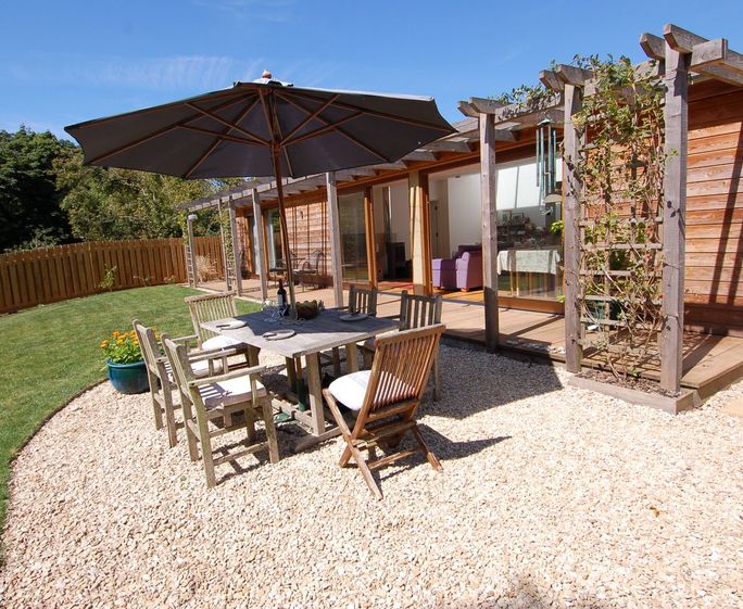 In Tipton St John, a stylish single-storey cottage privately set in the grounds of the owner’s house. Own enclosed large garden, beautifully planted and good for spotting birds. From the parking area, a gravel path slopes gently down to the front door.Porch (washing machine, freezer) for coats/boots. Spacious, light open-plan living/dining/kitchen (dishwasher, microwave, fridge, electric cooker) with woodburner, TV/DVD and floor-to-ceiling sliding glazed doors looking over the garden and opening to a deck (table/chairs) along the length of the cottage. Two bedrooms - a double with glazed sliding door to the garden, and a family bunk room with double base and single top bunk. Bathroom (suite, shower over bath). Loo. A smart holiday home for exploring east Devon’s countryside, towns and ‘World Heritage’ coast.Please note these are 2017 property details; there may be differences when booking for 2016 please check with Helpful Holidays