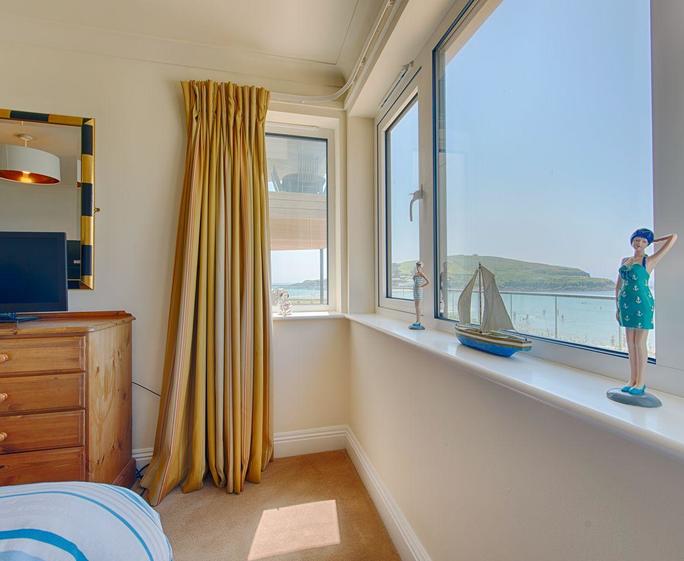 No 8. Exceptional - the best site of all. The ground-floor corner apartment with a double aspect terrace three times the size of all other ground-floor terraces; superb views, table/chairs, loungers, gas barbecue. Inside, hardwood floors (rugs) in living areas; carpeted bedrooms. Furnished in oak; decorated in neutral colours and contemporary coloured fabrics, seaside themes. Good-sized living/dining room (sofa bed, TV/Sky/DVD) and slightly recessed Shaker kitchen (dishwasher, washer-drier, microwave, fridge-freezer); glazed doors to terrace. Two bedrooms, both with sea views – double (5’ bed) plus single bed with en suite bathroom (suite plus bath-shower), twin with en suite shower-room (power-shower, suite). Best for maximum of 4 adults.