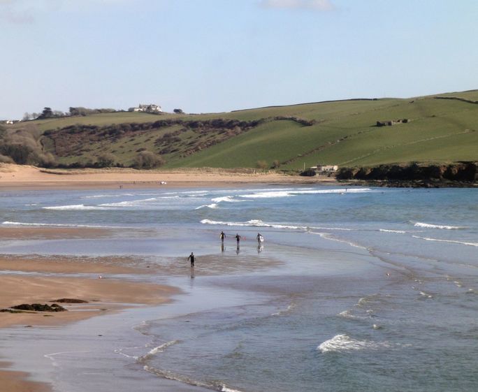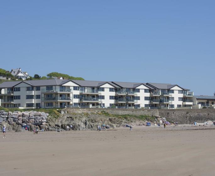 ... 20 yards from Bigbury-on-Sea's big and splendid sandy beach, and looking at Burgh Island over the low-tide sandy causeway, is this truly excellent and very greatly appreciated development of 29 high quality apartments of which we let 12, and, within the building, a very good private Leisure Club. The views over the sea to the south and west, and at low tide of a huge expanse of smooth washed yellow sand reaching to Burgh Island, are outstanding. The island's jolly pub, The Pilchard, is fun to visit (long-legged sea tractor at high tide).