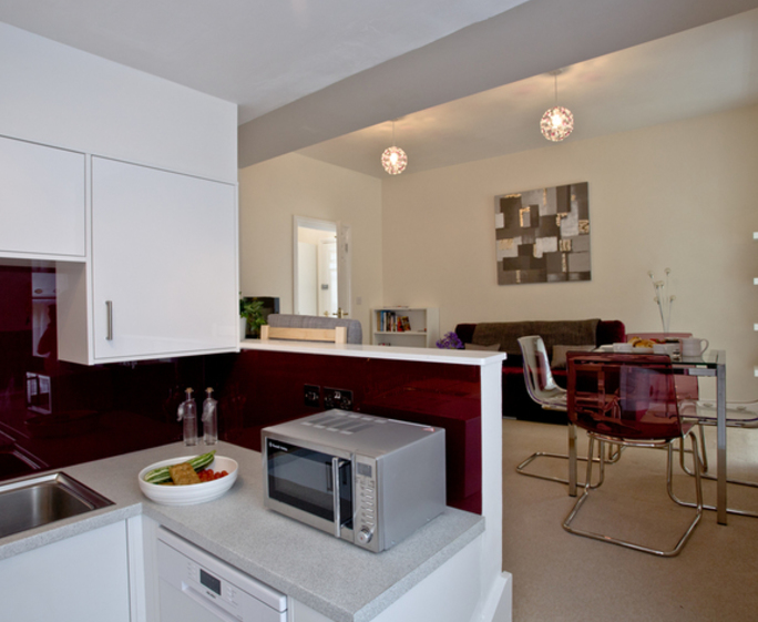 Open plan with the living and dining areaSingle electric oven with integrated grill and halogen hobMicrowave, fridge with ice box and washer/dryer