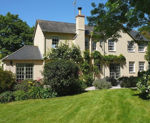 ... in Abbotskerswell, in a peaceful spot on the edge of the village with rolling fields and woodland beyond, a large, south-facing, detached, family home. Two acres of enclosed garden (mostly grass - sloping in parts, big trees, good planting, gazebo with table/chairs/barbecue) surround it, with terraces and well-positioned seating to enjoy sun throughout the day. At the top of the garden (care needed with young children), a play fort with slide/ladder and toddlers' swing.