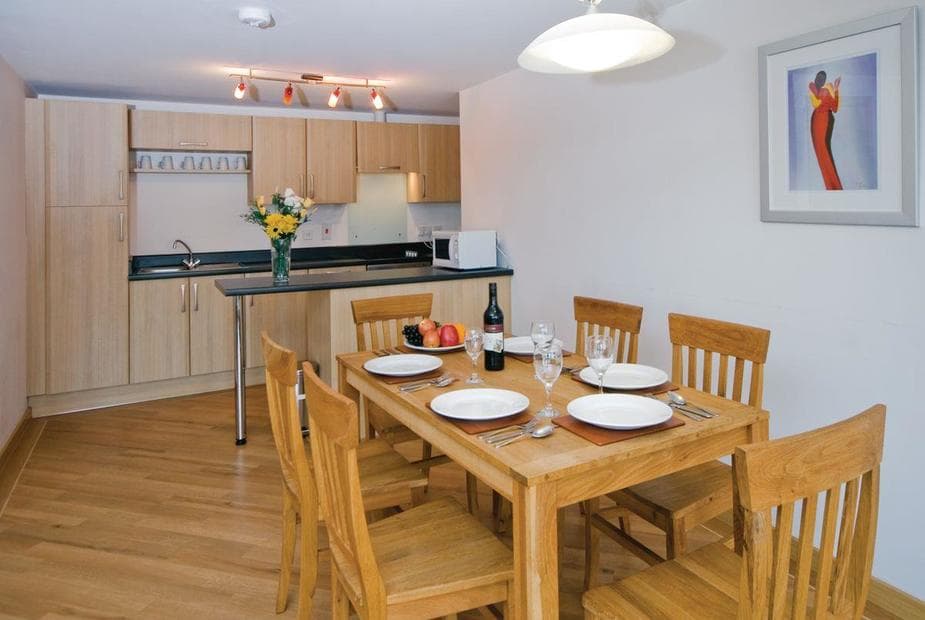 Ground floor apartment with one double, one twin and one with bunks. Bathroom with bath and separate shower. Open plan lounge/kitchen/diner with doors opening onto patio. Suitable for parties including visitors with partial disabilities – please check when booking.