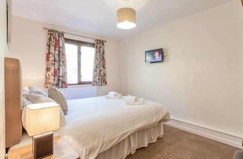 Terraced lodge with one king size double with TV and one twin. Bath with overhead shower. Additional sleeping for two in the lounge area. Dishwasher and washer/dryer. No pets.