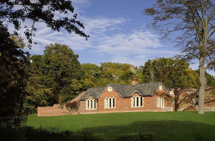 Garden Cottage is a beautifully restored four-bedroom Victorian cottage built into the wall surrounding the estate’s original flower and vegetable garden. Built around 1848 in the cottage orne (or decorated cottage) style by the Brook family, the picturesque former head gardener’s cottage occupies an elevated position overlooking woods and hedgerows. This Suffolk White brick cottage features gothic round-headed ogee mouldings to bargeboards and round-headed windows with tuck pointing beneath a slate roof.
